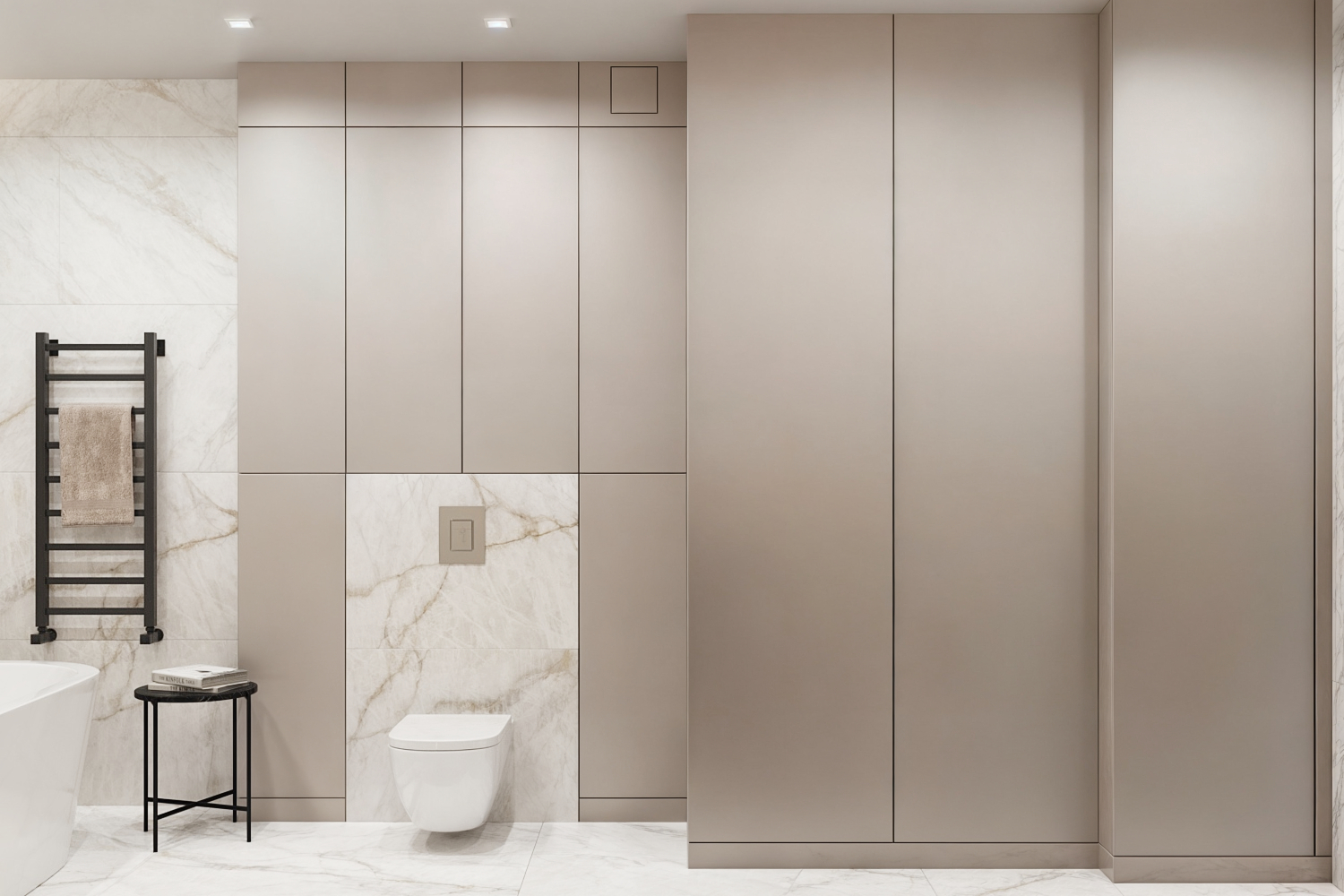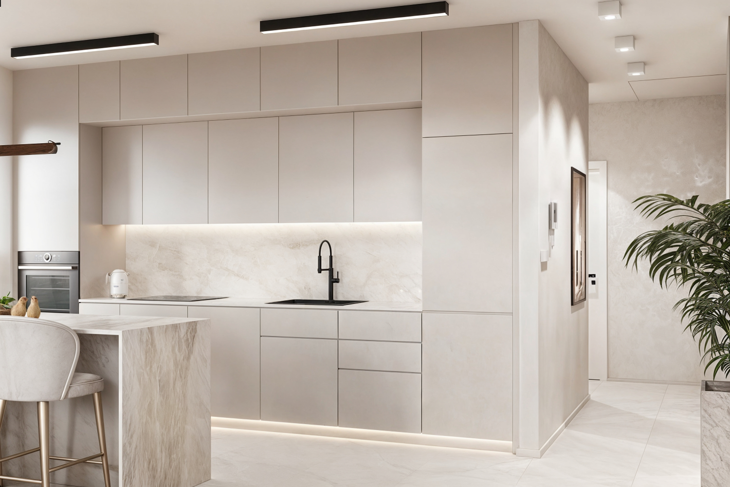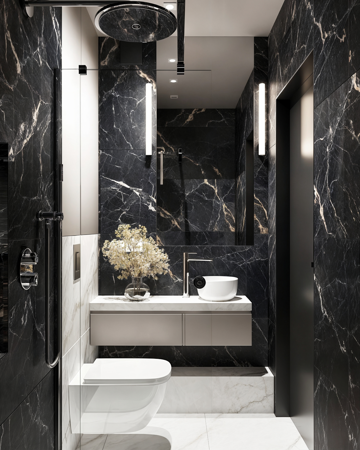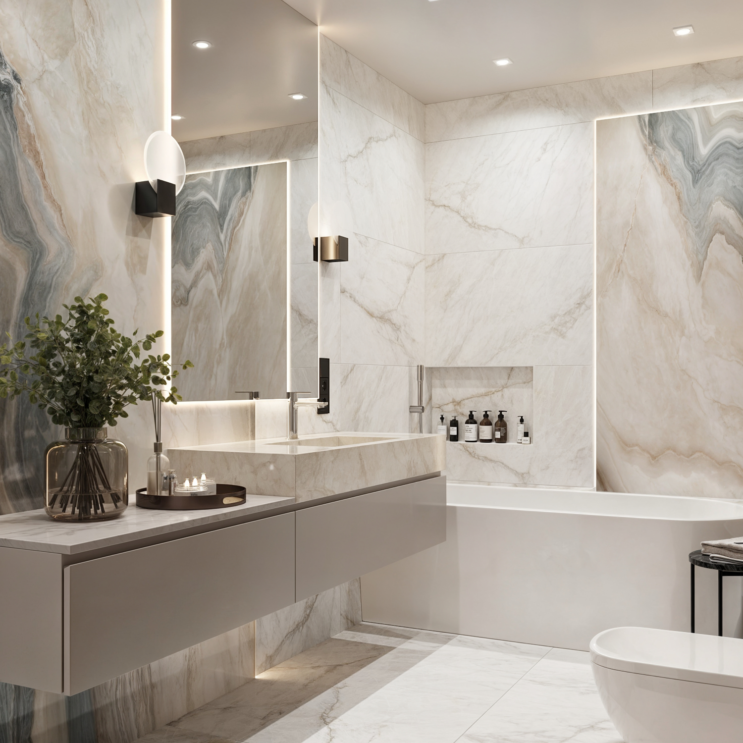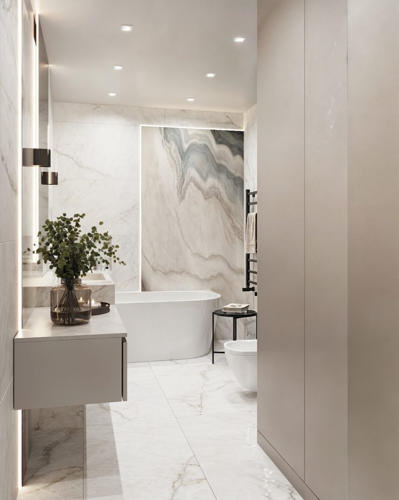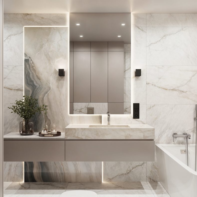 Łazienka zaprojektowana w duchu nowoczesnej prostoty, gdzie elegancja marmuru spotyka się z naturalnością roślinnych akcentów.