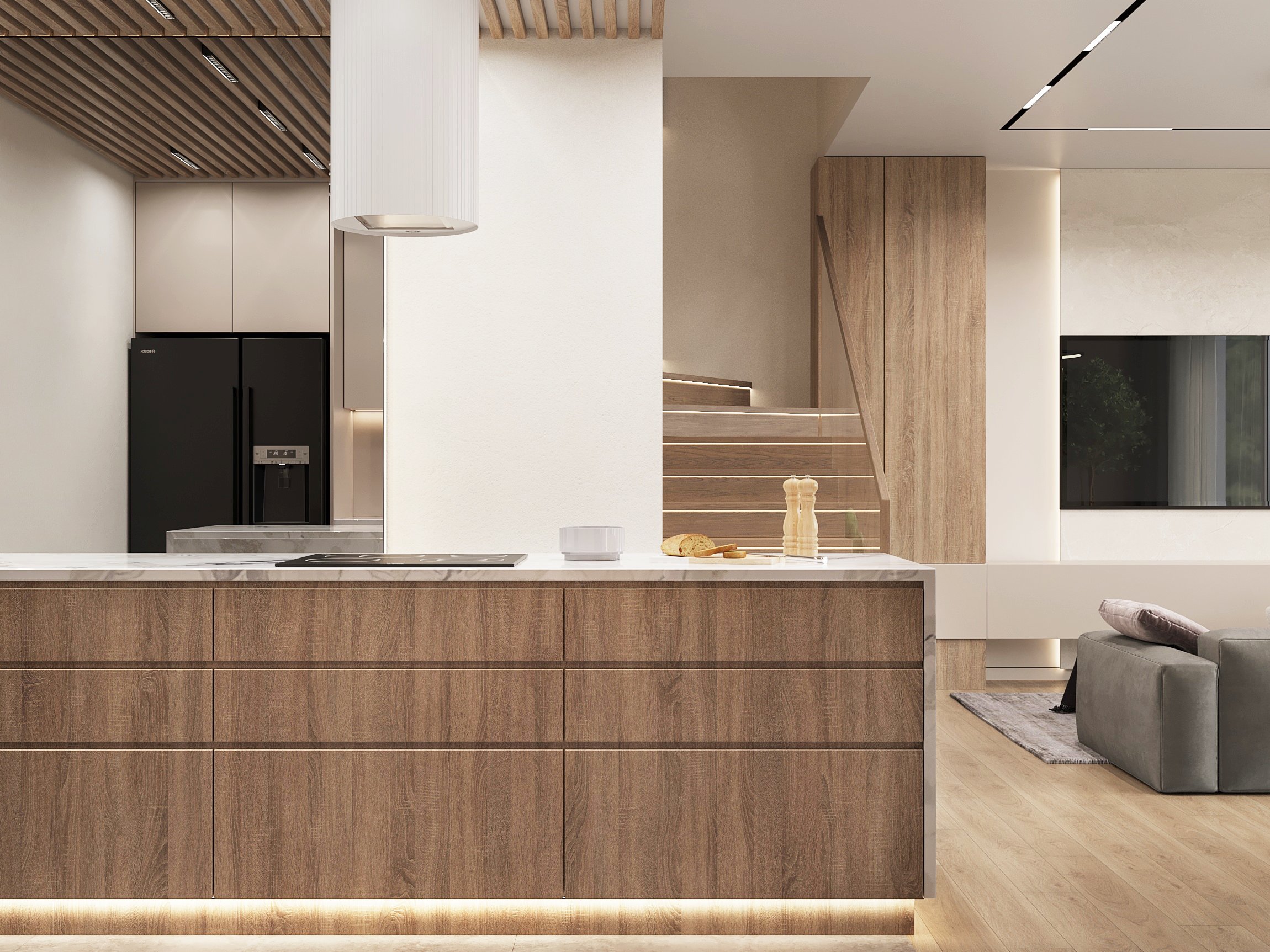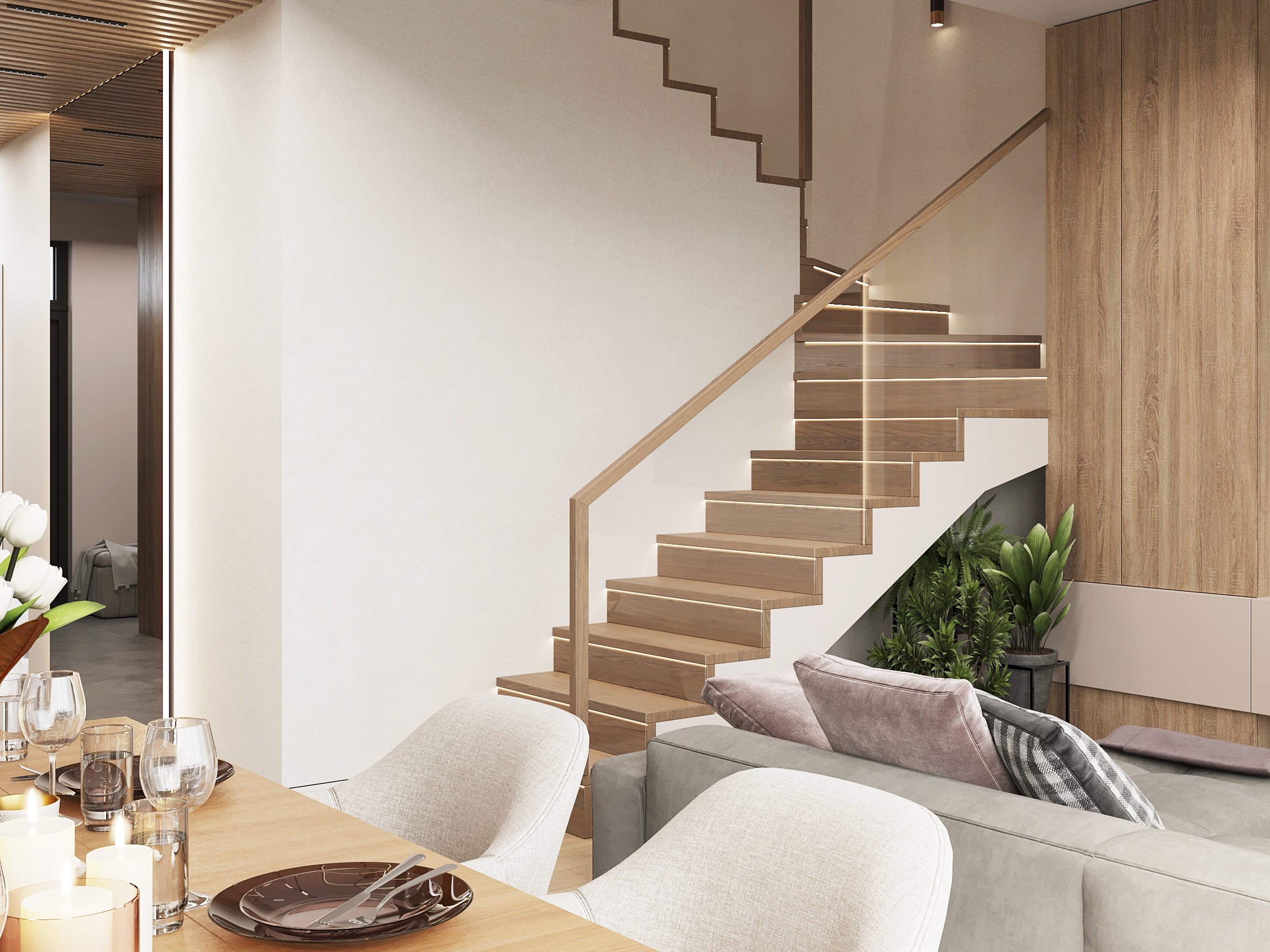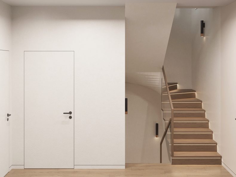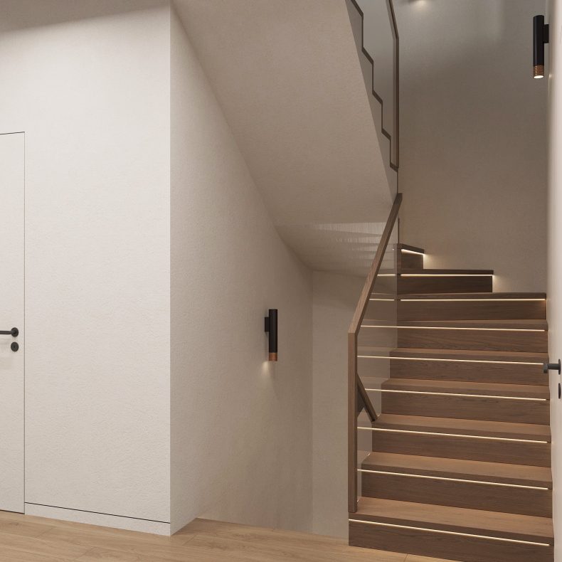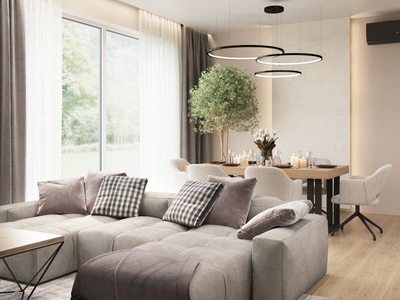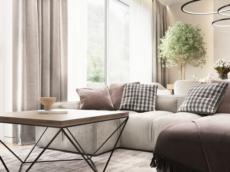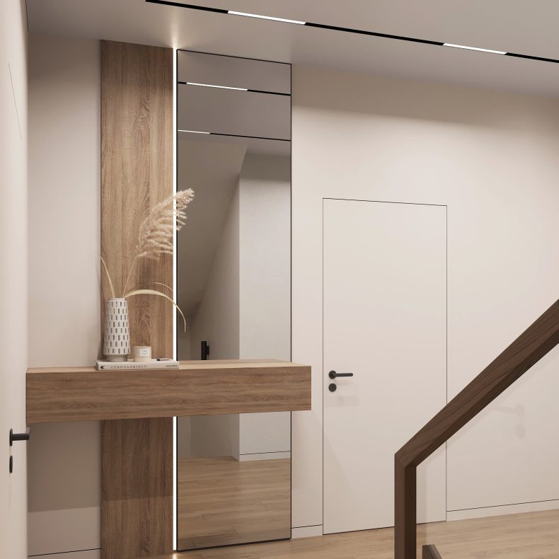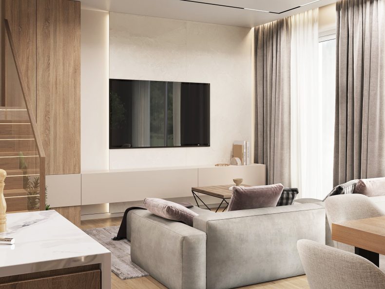 Nowoczesne wnętrze domu w Warszawie łączy elegancką prostotę z przytulnymi akcentami naturalnych materiałów. Przestronne, jasne pomieszczenia tworzą harmonijną i funkcjonalną przestrzeń do życia.