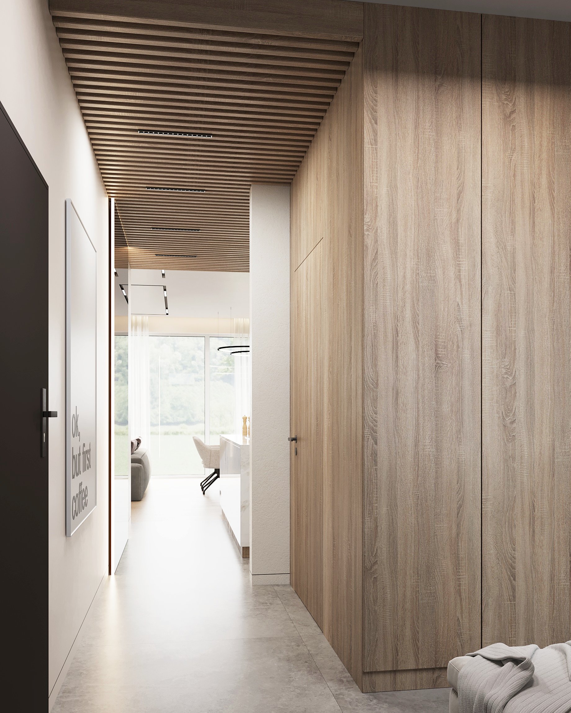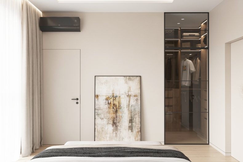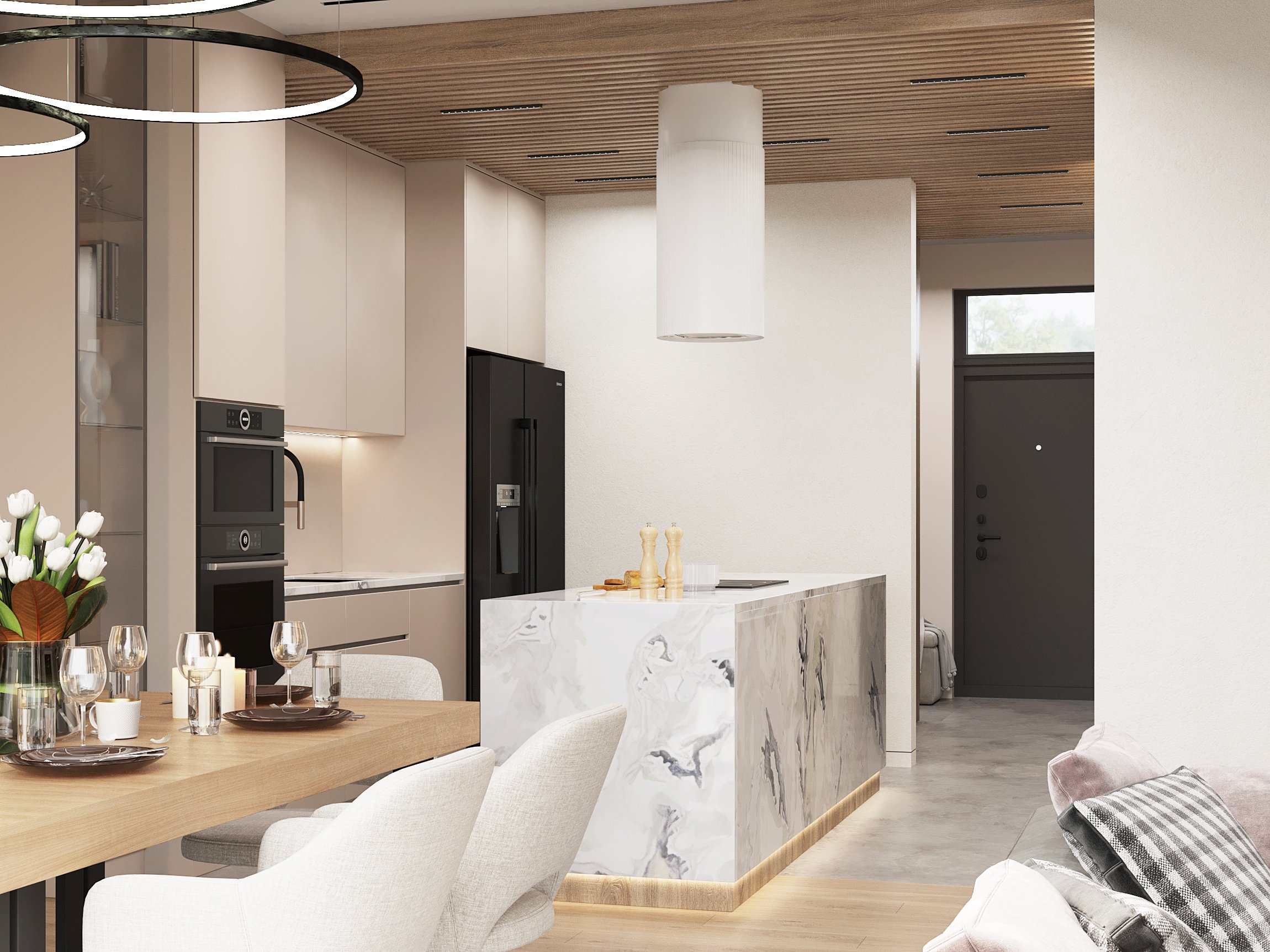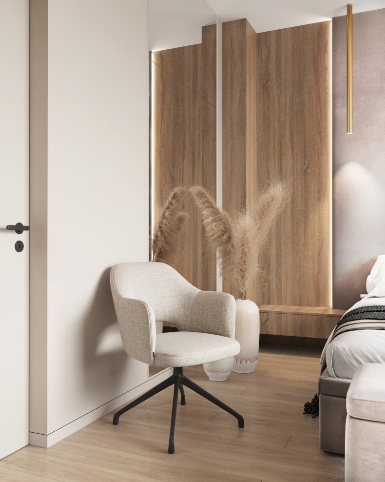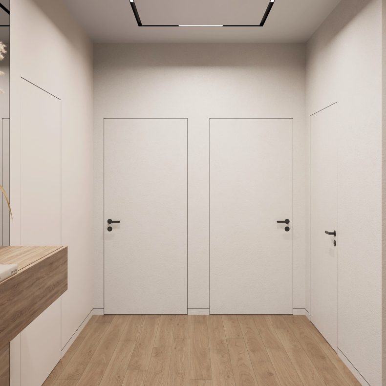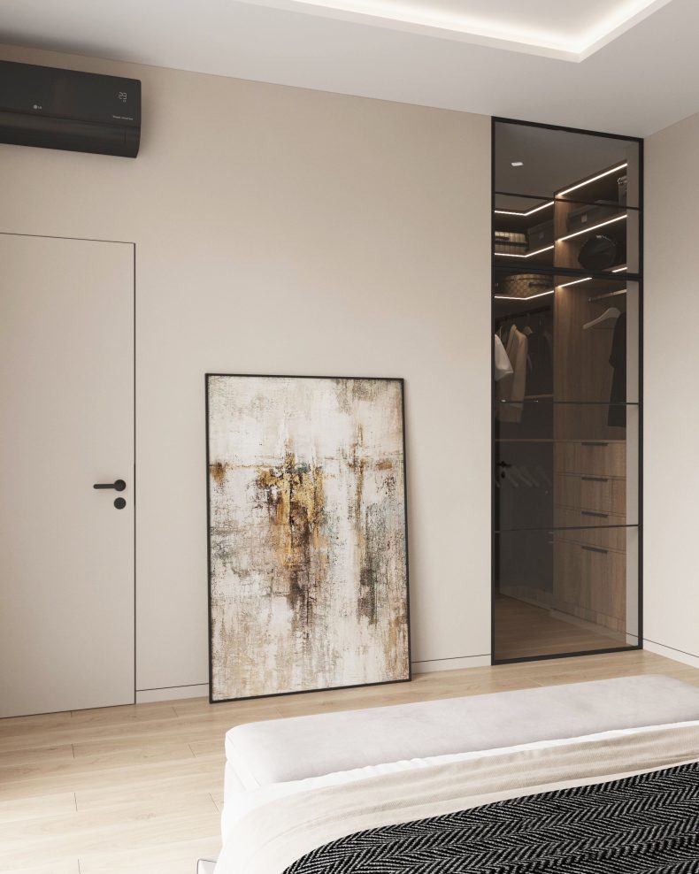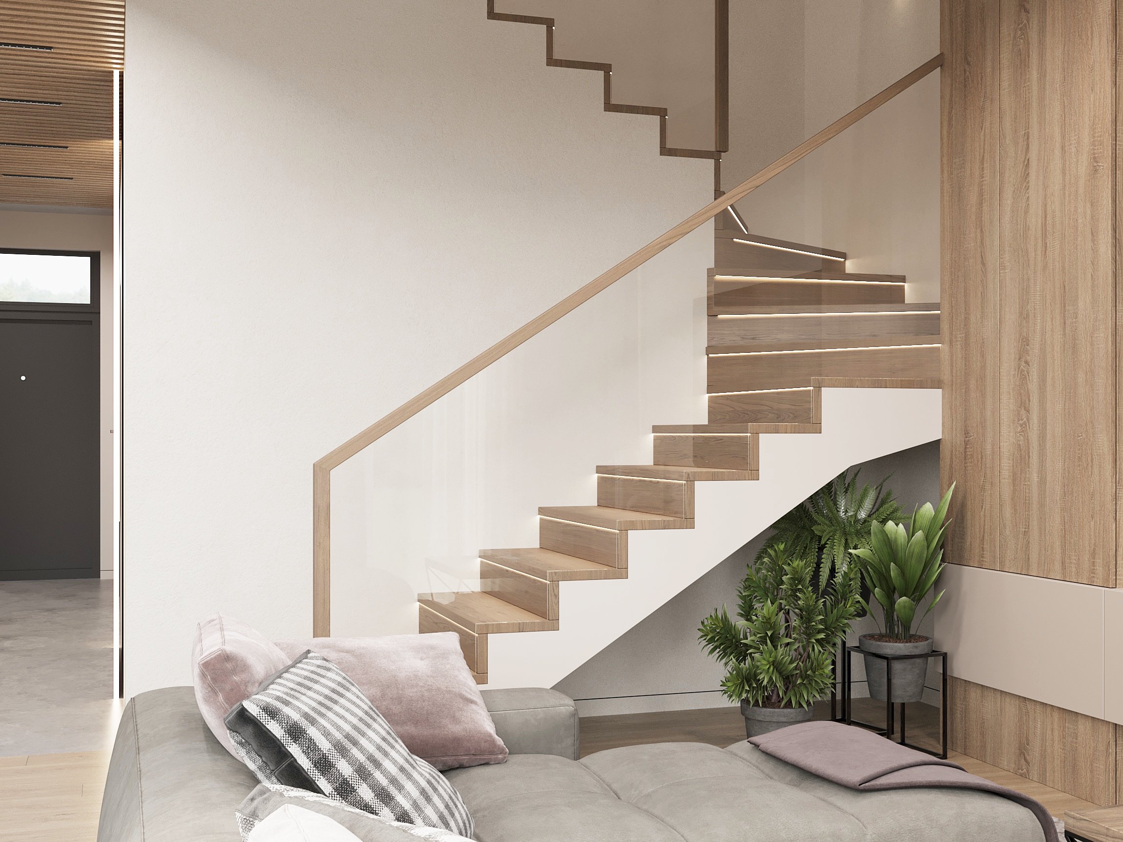 Nowoczesne wnętrze domu w Warszawie łączy elegancką prostotę z przytulnymi akcentami naturalnych materiałów. Przestronne, jasne pomieszczenia tworzą harmonijną i funkcjonalną przestrzeń do życia.